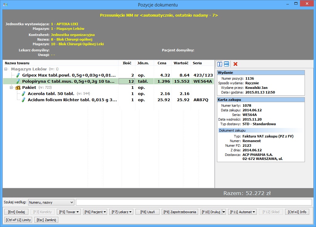 bogactwo metod wydawania leków z odpowiednim przeliczaniem i kontrolą przekazywanych ilości (według nazw handlowych, kodów apteki, kodów kreskowych producenta, kodów kreskowych apteki, nazw międzynarodowych, synonimów itp.),