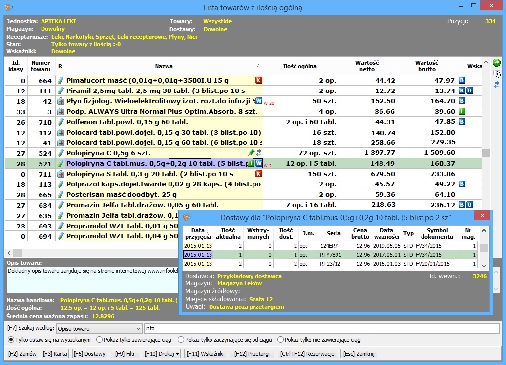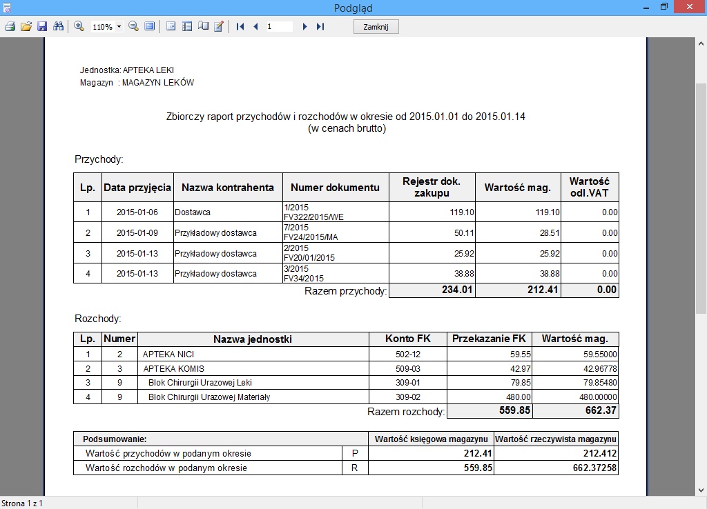 wykonywanie zestawień rozchodu i przychodu leków uwzględniających szeroki wachlarz parametrów do wyboru;