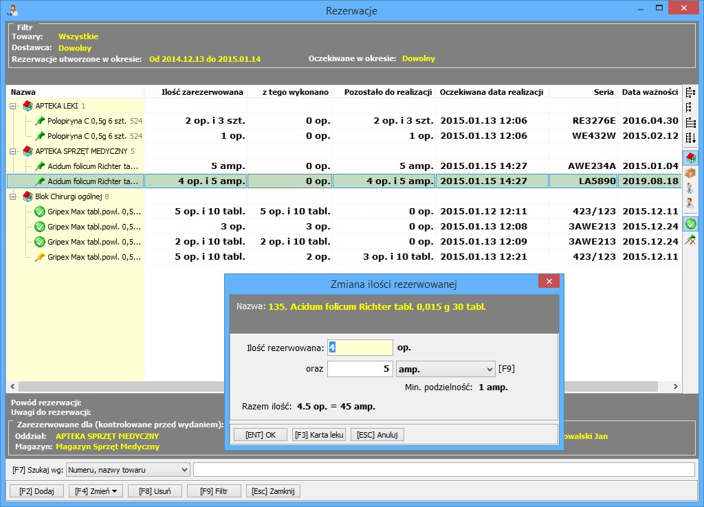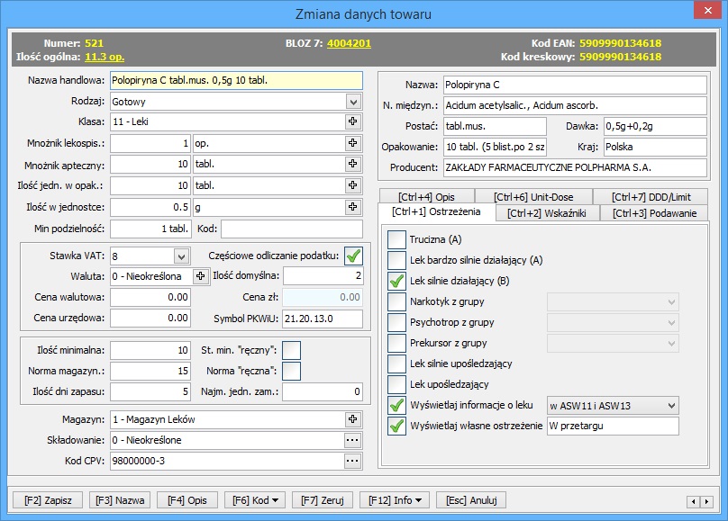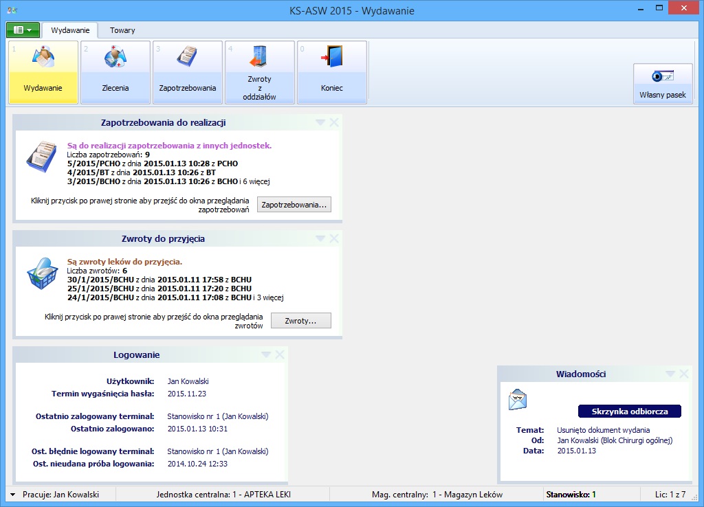 możliwość przeprowadzenia dowolnych operacji związanych z magazynem leków (poprawa bazy leków, przegląd i poprawa kart zakupu, zwroty dostaw, analiza stanu magazynowego, wstrzymania leków),