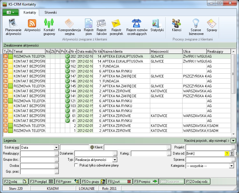 Ewidencja klientów obejmująca pełny zestaw danych o klientach – dane ogólne, adresowe, namiary, osoby kontaktowe, relacje pomiędzy klientami, obroty. Możliwość dowolnego rozszerzania zakresu gromadzonych danych;