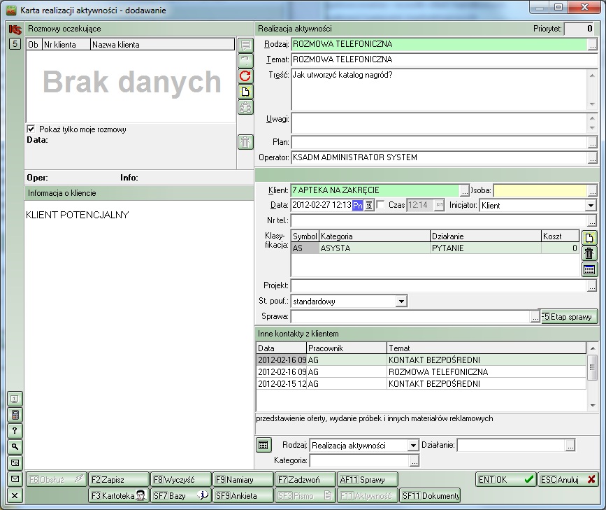Rejestracja – pełne wspomaganie procesu kontaktu z klientem obejmujące natychmiastowy dostęp do najistotniejszych danych o kliencie, wykorzystanie procedur obsługi klienta będących „scenariuszami” postępowania, dostęp do pełnej historii kontaktów z klientem;