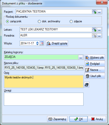 •wprowadzanie do karotek pacjentów plików zdjęć (np. obrazów z badania RTG). Do systemu wprowadzono również narzędzie do obróbki obrazów medycznych. Dzięki temu Użytkownik może dowolnie zaznaczać ważne elementy za zdjęciu, dokonywać pomiarów, skalować, ustawiać parametry obrazu, np.: ostrość, kontrast;