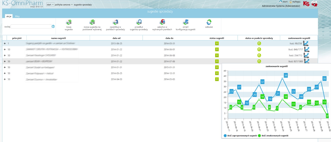 Rozwiązanie wspiera realizację procesów biznesowych przede wszystkim w obszarach związanych ze sterowaniem pracą aptek w sieci. Zarządzanie polityką cenową, negocjacje z dostawcami, zarządzanie personelem, czy też organizowanie centralnej kartoteki towarów to tylko nieliczne z możliwości tego rozwiązania. Osoba zarządzająca, by móc trafnie podjąć decyzję biznesową, musi bazować na rzetelnych danych dostarczonych szybko i w przejrzysty sposób. KS-OMNIPHARM jest rozwiązaniem klasy Business Intelligence spełniającym te założenia. Wielowymiarowe analizy, zarówno przekrojowe jak i szczegółowe, towarzyszą użytkownikowi na każdym etapie realizacji procesów, sugerując najbardziej optymalne rozwiązanie.