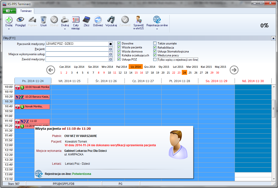 Terminarz - proste oraz przejrzyste planowanie wizyt pacjentów na kolejne dni, do poszczególnych lekarzy (z uwzględnieniem wizyt domowych). W przypadku instalacji sieciowej lista pacjentów jest automatycznie widoczna na stanowisku komputerowym lekarza, co ułatwia obsługę wizyt.