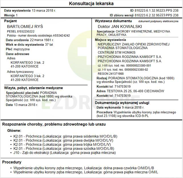 Dodatkowo, dane wizyty stomatologicznej zapisane są w formacie HL7 CDA z możliwością migracji wizyt do innych systemów