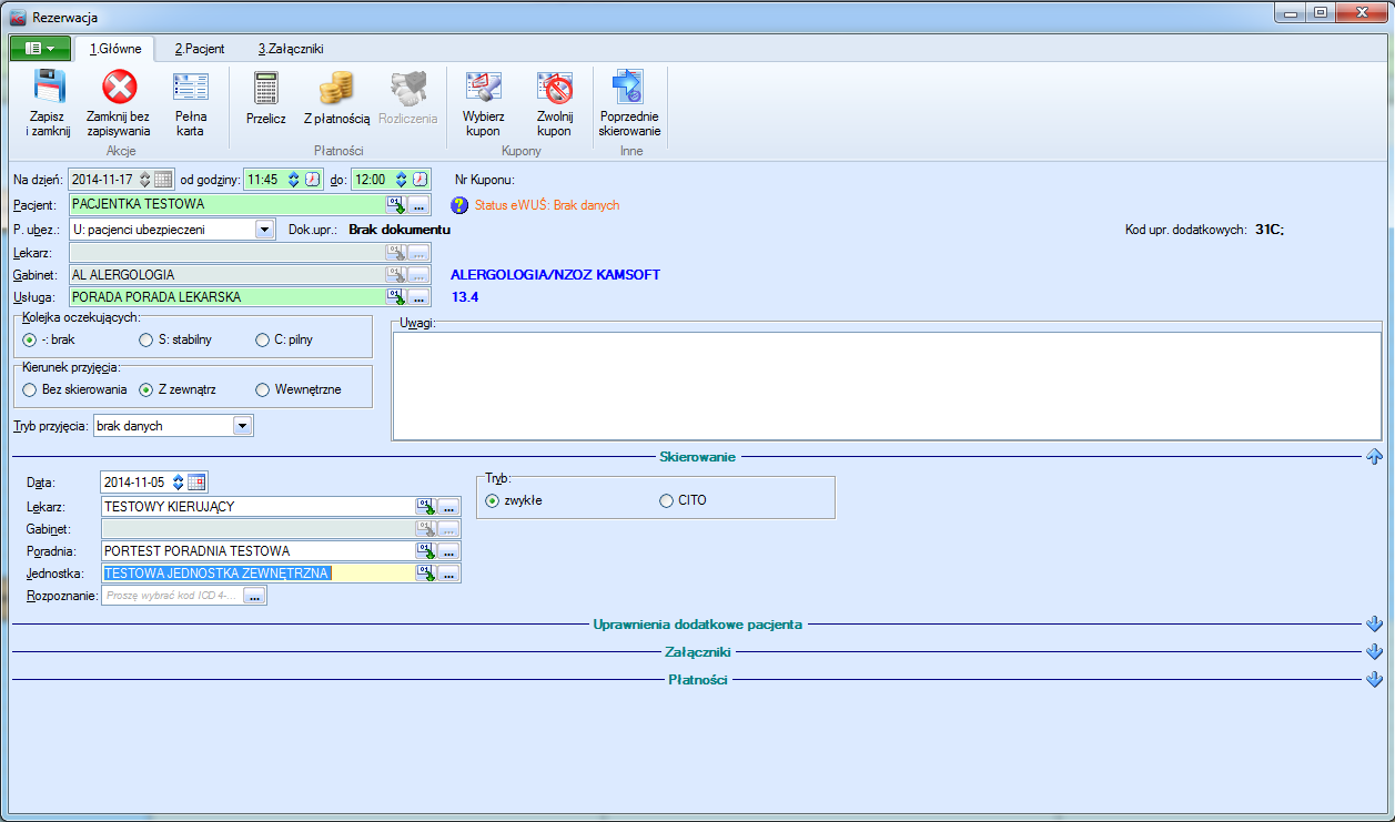 - ZLECENIA -moduł ten rejestruje wszystkie zlecenia wykonywane na rzecz pacjenta. Obsługa zlecenia jest kontrolowana począwszy od przyjęcia skierowania na usługę zaczynając, na zamknięciu zlecenia (czyli rozliczenia z płatnikiem) kończąc;