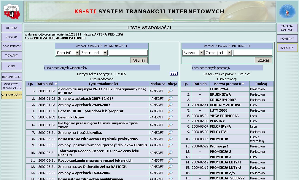 - Wiadomości KS-SIA, dzięki czemu odbiorca hurtowni zawsze będzie miał aktualne informacje. Nadawcami wiadomości mogą być: izby aptekarskie, kasy chorych, hurtownie farmaceutyczne oraz KAMSOFT.