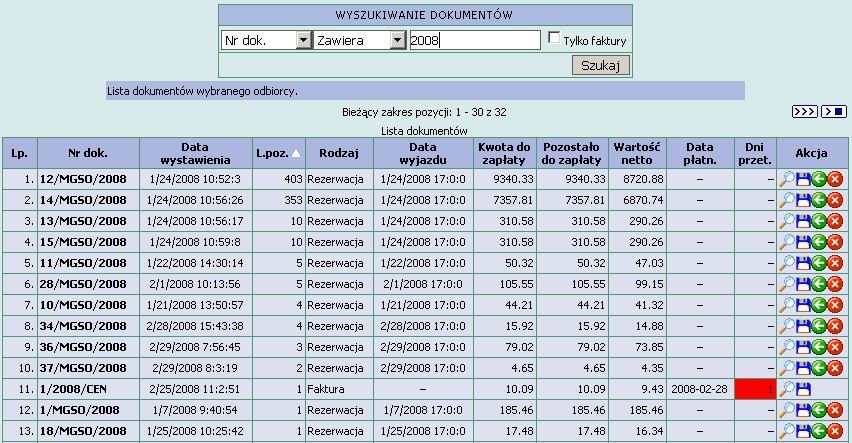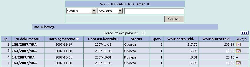 Aplikacja umożliwia składanie reklamacji do poszczególnych pozycji dokumentu jak i do całego dokumentu. Umożliwia kontrolę statusu reklamacji.