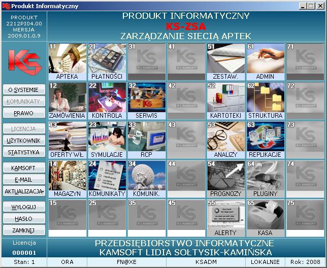 System komputerowy KS-ZSA jest kompleksowym narzędziem wspomagającym zarządzanie siecią aptek. System pozwala na optymalizację ekonomiczną przedsiębiorstwa rozproszonego. Wiele lat współpracy z Klientami zaowocowało powstaniem produktu bardzo przyjaznego dla użytkownika i, co szczególnie istotne, bardzo elastycznego. Około 400 współpracujących z KAMSOFT firm serwisowych zapewnia sprawne wdrożenie oraz wsparcie w trakcie eksploatacji systemu. Wszelkim działaniom naszej firmy przyświeca idea rzetelnej i profesjonalnej pracy wzbudzającej zaufanie i dającej gwarancję wieloletniej obsługi. KS-ZSA w bezpośredni sposób może współpracować z systemem kadrowo-płacowym, finansowo-księgowym lub książką przychodów i rozchodów naszej firmy. System składa się z kilkunastu wzajemnie powiązanych modułów zapewniając bardzo szeroki zakres funkcji, który zadowoli nawet najbardziej wymagających Użytkowników. Duże możliwości idą w parze z prostą i intuicyjną obsługą, dzięki czemu opanowanie podstawowych funkcji programu nie sprawia trudności. Wszystkie możliwości szczegółowo są opisane w obszernej i przejrzystej dokumentacji użytkownika. KS-ZSA jest nieustannie rozwijany, tak aby coraz lepiej spełniał swoje zadania. Rozwój obejmuje też dostosowanie systemu do obowiązującego stanu prawnego (zapis ten nie oznacza, że funkcjonalność obejmuje wszystkie dopuszczalne prawem przypadki a jedynie, że dostępna funkcjonalność działa zgodnie z obowiązującym prawem.