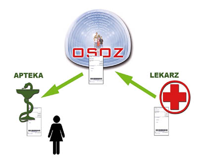 wprowadzić do systemu. Drukowane są wszystkie wymagane elementy, w tym kody kreskowe. Lekarz tylko podpisuje gotowy druk.