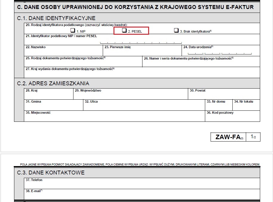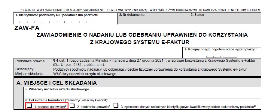 Zawiadomienie o nadaniu lub odebraniu uprawnień do korzystania z Krajowego Systemu e-Faktur (ZAW-FA) – instrukcja jak wypełnić.