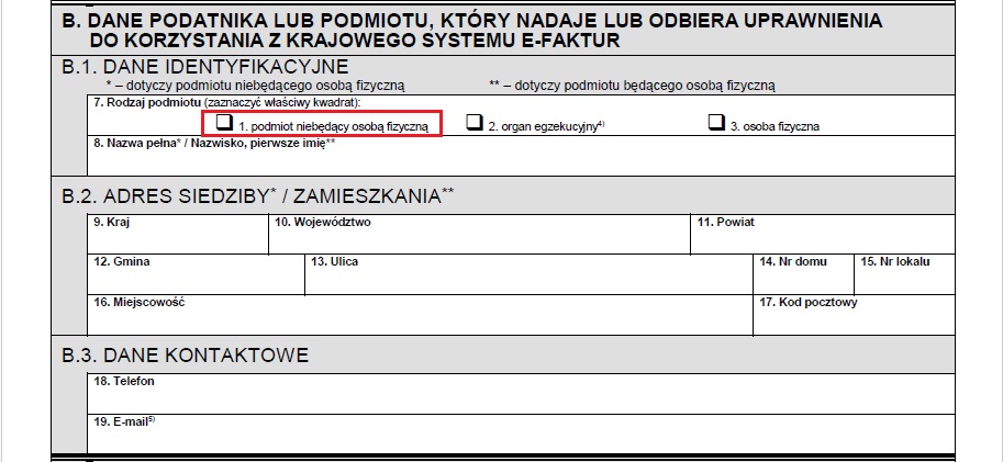 Część B. Dane podatnika lub podmiotu, który nadaje lub odbiera uprawnienia do korzystania z Krajowego Systemu e-Faktur