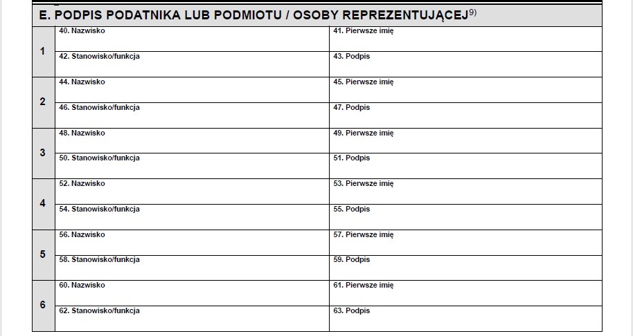 - W pozycjach od 40. do 43. należy wpisać dane podmiotu lub osoby reprezentującej (najczęściej są to dane właściciela) wraz z podpisem.