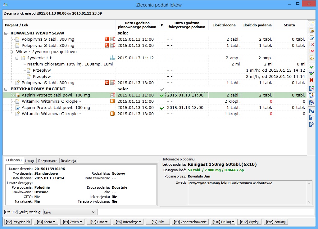 realizacja zleceń podań leków przekazanych z systemu KS-MEDIS, ręczne tworzenie zleceń,