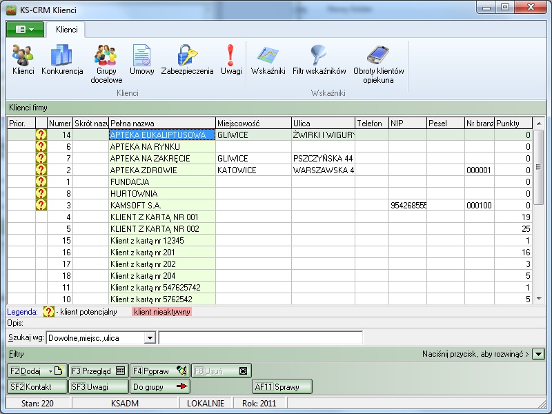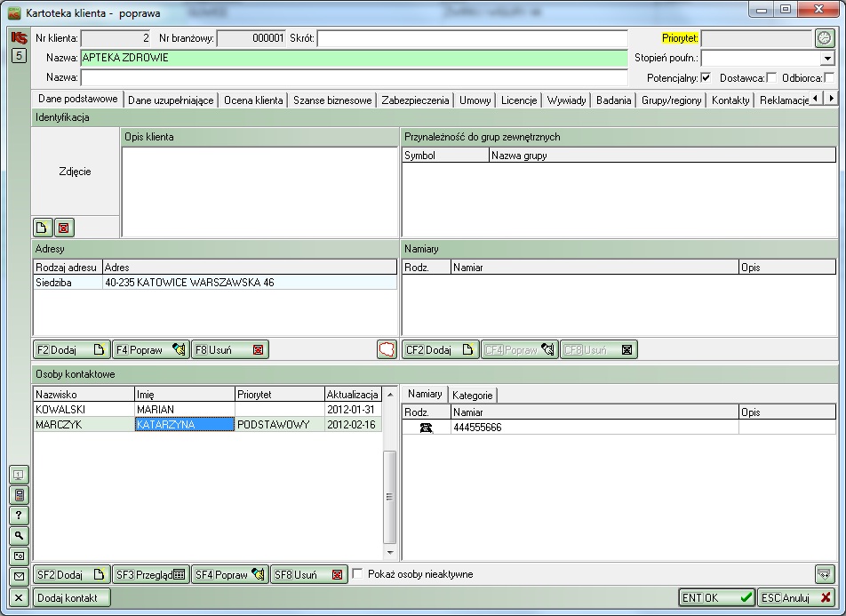 Ewidencja klientów obejmująca pełny zestaw danych o klientach – dane ogólne, adresowe, namiary, osoby kontaktowe, relacje pomiędzy klientami, obroty. Możliwość dowolnego rozszerzania zakresu gromadzonych danych;