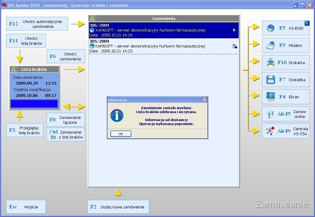 składanie zamówienia - przesyła zamówienie z apteki do dostawcy, dokonuje automatycznej rezerwacji towarów oraz odbiera potwierdzanie (listę braków). Dzięki KS-EWD czas złożenia zamówienia skraca się diametralnie, natomiast sam proces składania zamówienia sprowadza się do kilku kliknięć myszką.