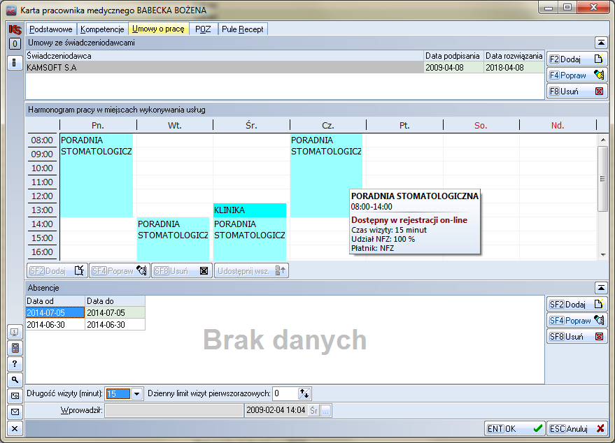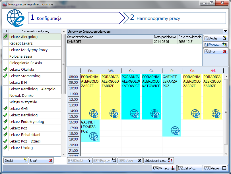 Kontrakty - moduł zarządzania umowami z NFZ. Pozwala na obsługę umów, kontraktów, rachunków refundacyjnych. Umowy wprowadzone w tym module są podstawą generowanych zestawień statystycznych do NFZ.