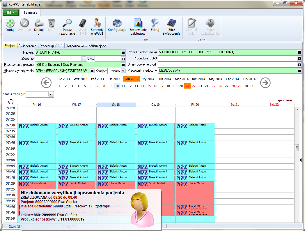 Rehabilitacja – moduł umożliwiający szybkie wprowadzanie powtarzających się świadczeń (np. powtarzanych zabiegów rehabilitacyjnych) za pomocą interfejsu terminarza z możliwością zaplanowania kolejnych wizyt pacjenta i wydrukowania dat i godzin wizyt dla pacjenta.