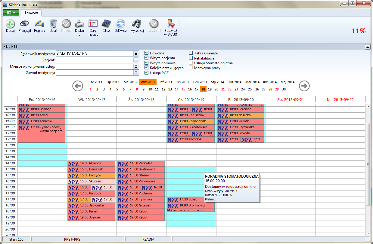 Terminarz - proste oraz przejrzyste planowanie wizyt pacjentów na kolejne dni, do poszczególnych lekarzy (z uwzględnieniem wizyt domowych). W przypadku instalacji sieciowej lista pacjentów jest automatycznie widoczna na stanowisku komputerowym lekarza, co ułatwia obsługę wizyt.