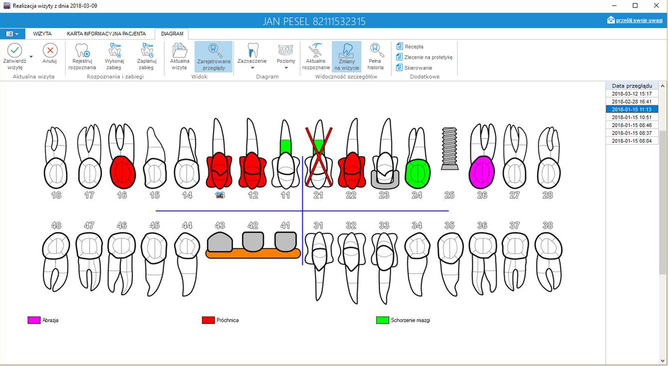 Wspiera w pełni procesy związane z rejestracją rozpoznań, przeglądów stanu uzębienia czy też rejestracją usług na poziomie