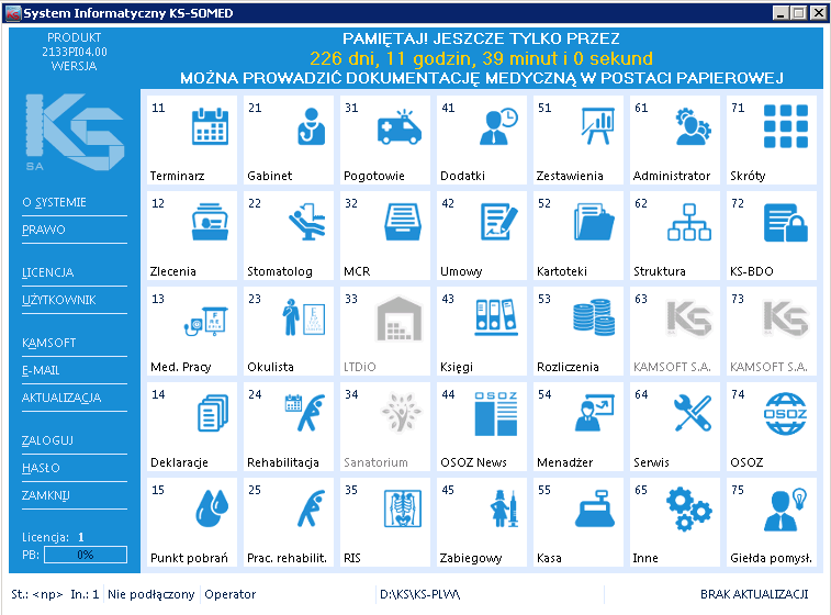 - MEDYCYNA PRACY (opcja dodatkowa) - wspomaga pracę lekarzy sprawujących profilaktyczną opiekę zdrowotną nad pracownikami określonych zakładów pracy. Głównym zadaniem modułu jest rejestrowanie pełnej historii badań wstępnych, okresowych oraz kontrolnych,