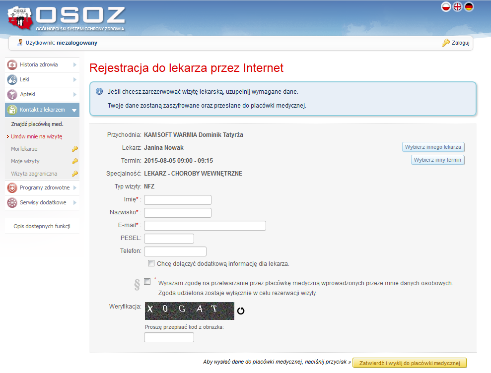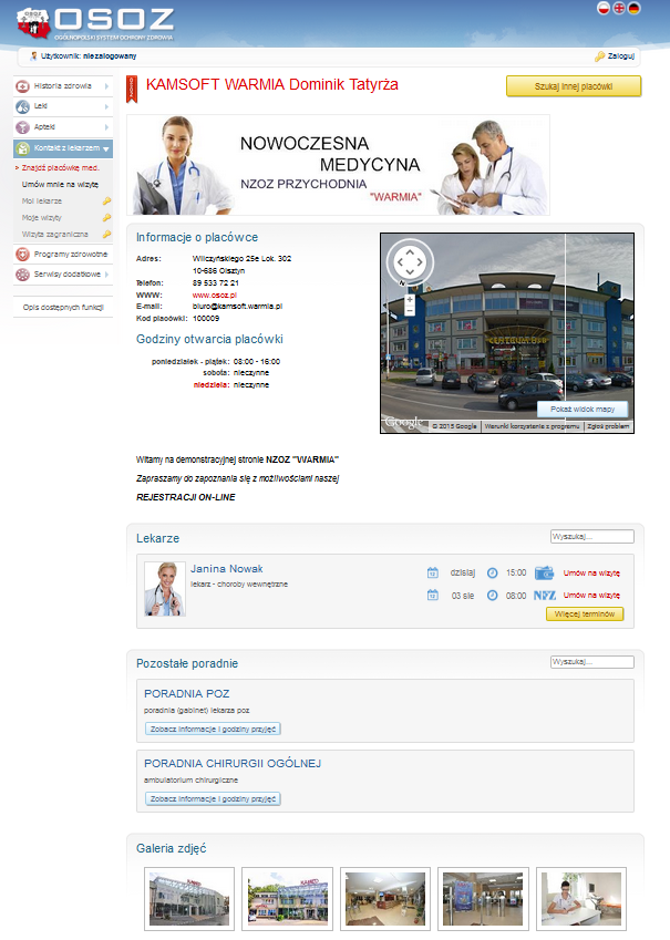 Do działania wymagane uruchomienie usług OSOZ. Nie ma konieczności zakupu aplikacji, na stronie przychodni umieszcza się obiekt udostępniony przez operatora.