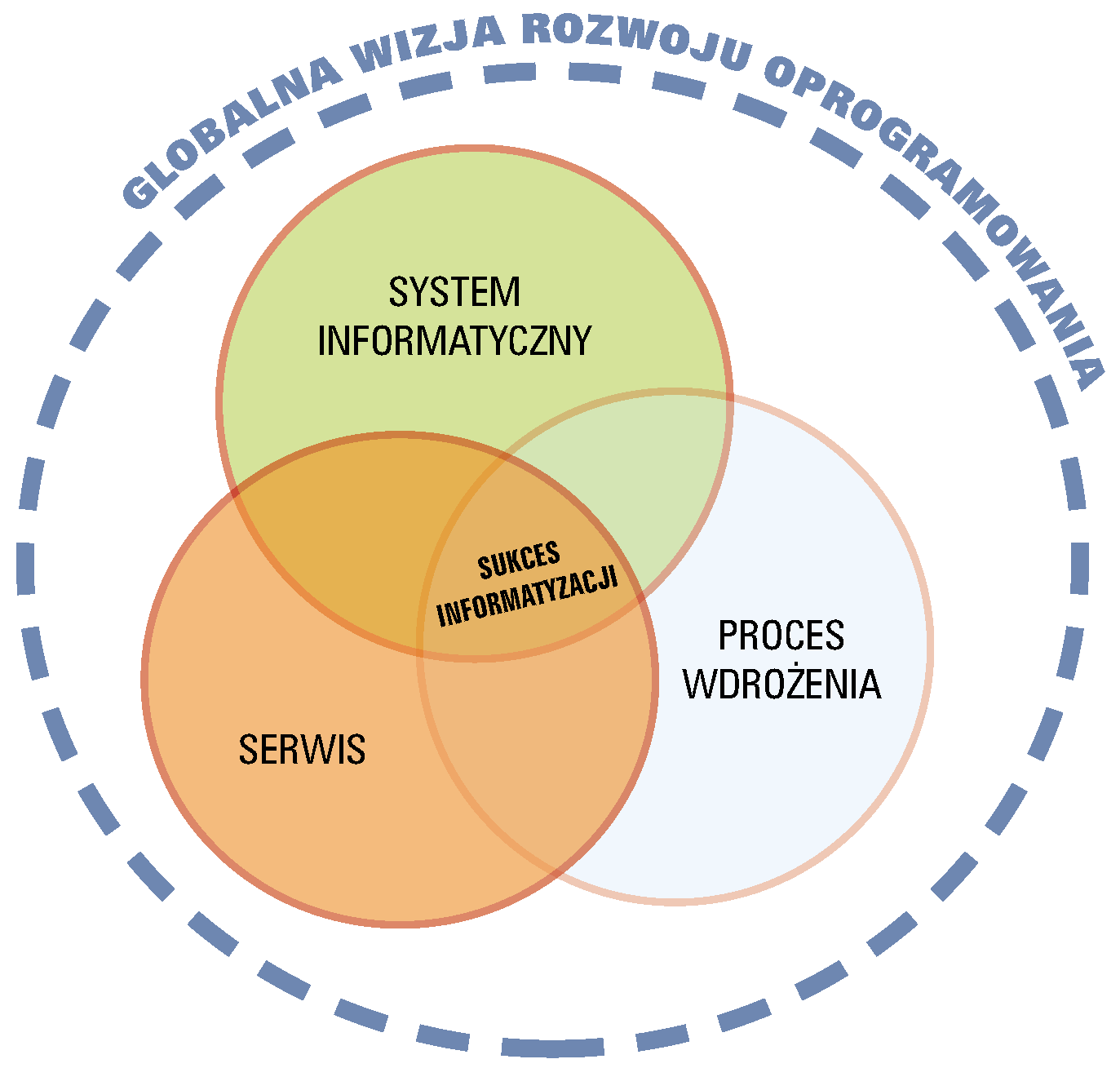 Rozpatrując na poziomie elementarnym sukces informatyzacji szpitala szybko dojdziemy do wniosku, że u jego podstaw leży kilka warunków koniecznych. Pierwszym i podstawowym jest dobrze opracowane oprogramowanie; uwzględniające charakter struktury organizacyjnej oraz plany rozwoju placówki, elastyczne, skalowalne do potrzeb użytkowników, oferujące szeroką funkcjonalność oraz obsługę wszystkich sfer funkcjonowania organizacji. I tak przykładowo elastyczność i dynamika zmian oprogramowania determinuje jego dalszą użyteczność. Otoczenie placówki medycznej ulega ciągłej ewolucji: zmieniają się przepisy prawne, wymagania Narodowego Funduszu Zdrowia, Ministerstwa Zdrowia, czy po prostu indywidualne oczekiwania szpitala. Bez ich uwzględnienia, zakupione narzędzie szybko stanie się bezużyteczne. Drugim warunkiem powodzenia procesu informatyzacji jest bez wątpienia proces wdrożenia. Pod tym pojęciem należy rozumieć wiązkę usług, począwszy od momentu pierwszych konsultacji pomiędzy zamawiającym a dostawcą po podpisaniu umowy, a skończywszy na uruchomieniu wszystkich wymaganych funkcji systemu informatycznego. Tutaj kumuluje się umiejętność firmy w adaptacji systemu do charakteru pracy placówki oraz przygotowaniu użytkowników do jego poprawnej eksploatacji. System informatyczny jest produktem i zarazem usługą w jednym. Firma informatyczna dostarcza nie tylko oprogramowanie, ale przekazuje tym samym całe know-how w zakresie jego efektywnego wykorzystania i możliwych rozwiązań o charakterze racjonalizatorskim.