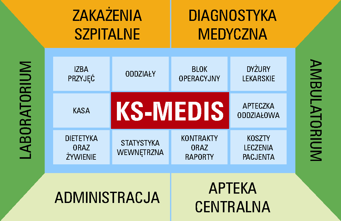 KAMSOFT oferuje swoim Klientom rozwiązania zintegrowane. Pod tym pojęciem kryje się zespół w pełni kompatybilnych systemów (z systemem nadrzędnym oraz podsystemami), gdzie każdy z podsystemów może tworzyć zarówno indywidualną aplikację jak i część większej spójnej struktury informatycznej. Innymi słowy – mamy do czynienia z rdzeniem oprogramowania, zbudowanym z zestawu typowych funkcji użytkowych i stanowiących podstawowy poziom informatyzacji; fundament pozwalający na „dobudowywanie” kolejnych funkcji (modułów). Takim rdzeniem w ofercie KAMSOFT kierowanej dla szpitali jest Zintegrowany System Informatyczny Zarządzania Szpitalem KS-MEDIS. System jest esencją nowoczesnej myśli technologicznej, innowacyjnego spojrzenia na strukturę organizacyjną polskich szpitali oraz wysokiej jakości narzędzi informatycznych. Co warte podkreślenia – jest oprogramowaniem polskim, a więc dostosowanym do realiów krajowego rynku usług zdrowotnych. Rdzeń systemu zintegrowanego to zestaw dowolnie komponowanych funkcji, dobieranych według własnych potrzeb użytkownika. Można do nich zaliczyć moduły tematycznie wspomagające obsługę takich dziedzin pracy szpitala jak: ruch chorych (izba przyjęć), oddziały, statystyka (umowy i rozliczenia z kontrahentami, np. NFZ oraz zestawienia wewnętrzne), zlecenia, dokumentacja medyczna, koszty leczenia pacjenta, planowanie wykorzystania zasobów oraz opcjonalnie – gospodarka żywieniowa oraz dietetyka. Pozostałe elementy układanki informatycznej prezentują się następująco:
