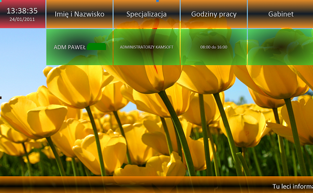 Terminarz INFO umożliwia prezentację godzin przyjęć lekarzy na wyświetlaczach naściennych. Pozwala na naprzemienne wyświetlanie tygodniowego grafiku pracy lekarzy (specjalizacja, godziny przyjęć), dzisiejszych godzin przyjęć lekarzy (specjalizacja, godziny przyjęć, gabinet), prezentację plansz informacyjnych np. reklam oraz prezentację dowolnego tekstu informacyjnego dla pacjentów.